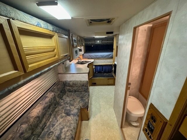 Stepping inside the Ponderosa M-11-DB, you are greeted by a cozy and well-thought-out interior. The tan upholstery creates a warm and inviting atmosphere, complemented by rich wood accents that add a touch of elegance. The layout is designed to maximize space and functionality, ensuring that you have everything you need for a comfortable stay.