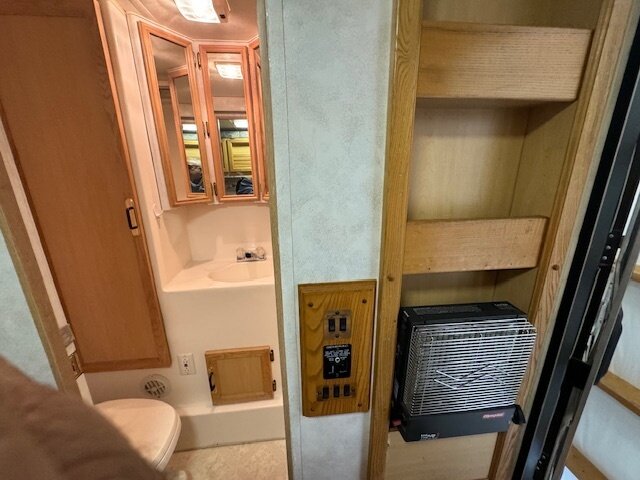 This 2003 S&S Truck Camper Ponderosa M-11-DB is equipped with numerous additional features to enhance your camping experience. A built-in air conditioning unit ensures that you stay cool during warmer months, while a heater allows for comfortable use during cooler weather. The electrical system is designed to run on both battery and shore power, providing flexibility in various camping situations