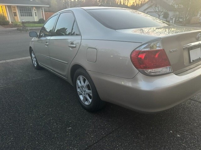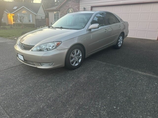 2005 Toyota Camry LE V6 — Gold exterior with Tan leather interior. Powered by the factory 3.0L V6 (210 hp, 220 lb-ft) paired with a 5-speed automatic transmission and front-wheel drive. Well maintained, below 192,000 miles (averaging under 9,000 miles per year) and described in excellent overall condition. EPA fuel economy is approximately 18 MPG city / 26 MPG highway.