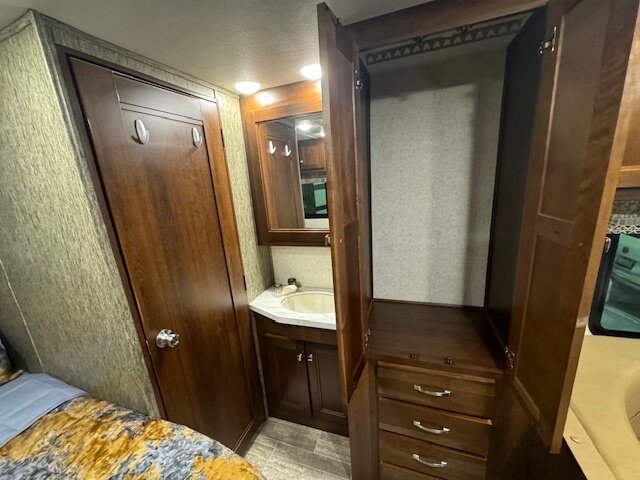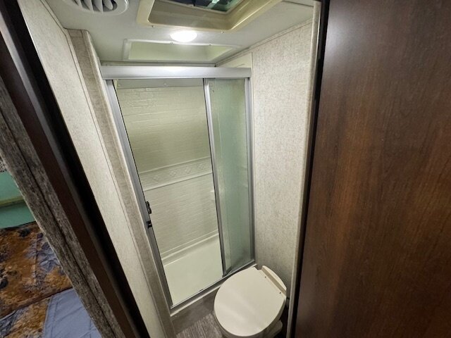 With excellent mileage under 9,000 miles, this motorhome has been driven less than 2,000 miles per year, ensuring that it remains in outstanding overall condition. The bathroom features a shower, toilet, and sink, providing all the necessary amenities for your travels.