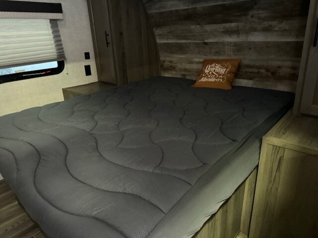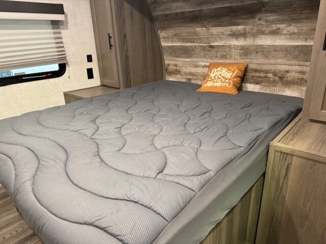 When it's time to rest and recharge, the bedroom area offers a cozy retreat. The comfortable queen-size bed is perfect for a restful night's sleep, ensuring that you wake up refreshed and ready for another day of adventure. Overhead cabinets and bedside storage provide convenient space to stow away your belongings, keeping the bedroom area neat and organized.
